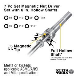 Klein 7 Piece Magnetic Tip Nut Driver Set with 6" Hollow Shafts