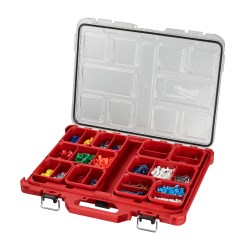 PACKOUT Low-Profile Organizer, 10 Removable Storage Bins (8 Small and 2 Large) with Removable Dividers, IP65 Rated Weather Seal, Transparent Lid, Heavy Duty Latches and Reinforced Hinges, No Travel Bin Seal Prevents Small Part Migration Between Bins, Integrated Center Slot for Long Bits and Baldes