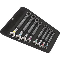 The 6000 Joker 8 Piece Set of Imperial Ratcheting Combination Wrenches Features Anti-Slip Double-Hex Geometry and Integrated Limit Stop which Reduces the Risk of Slipping Down around the Bolt Head, allowing Higher to be Applied. A Return Angle of only 30 Degrees at the Open End Prevents any Time Consuming Flipping of the Wrench During Fastening Jobs. Colour Coding by Size makes for Easy Tool Searching